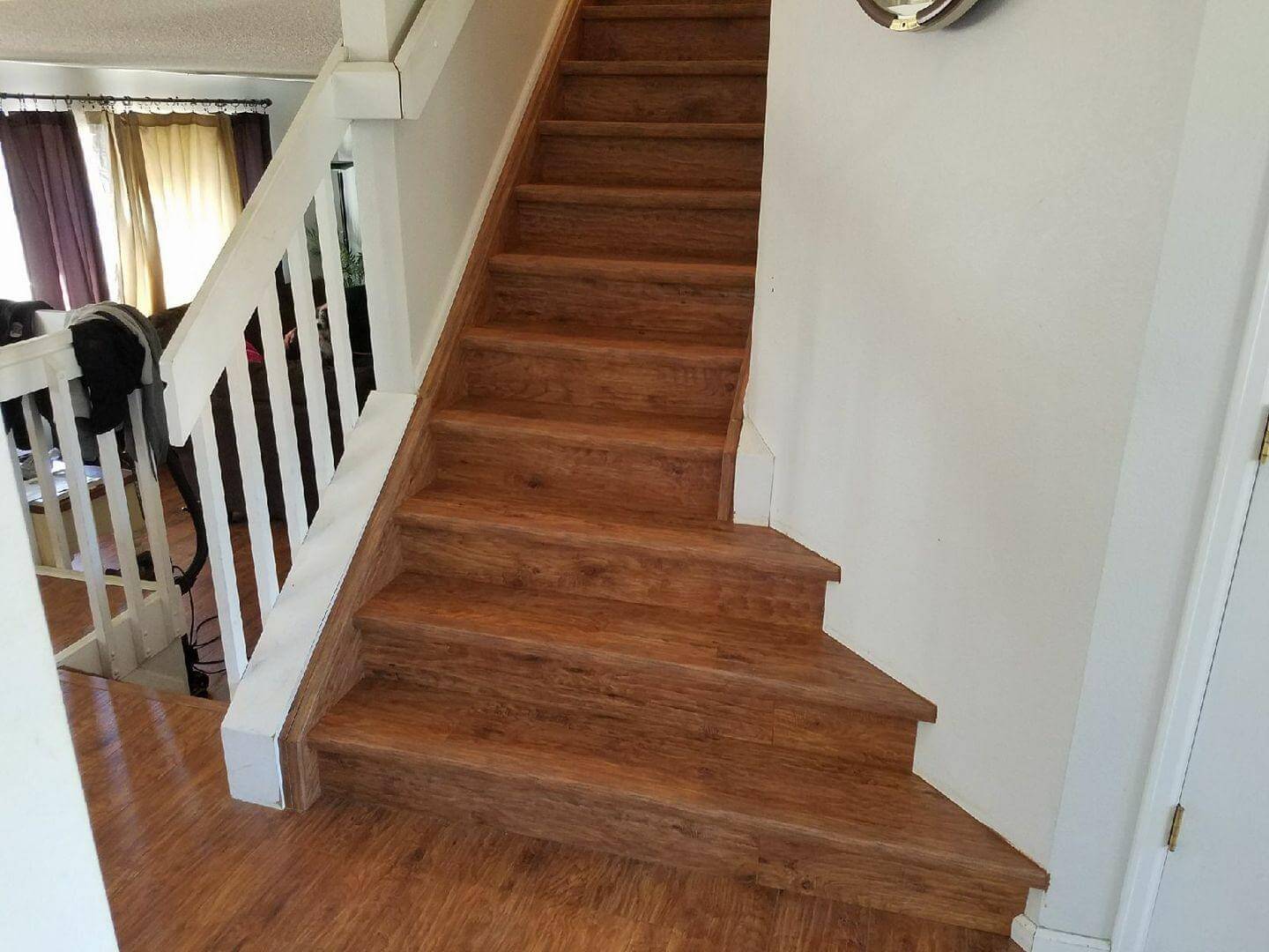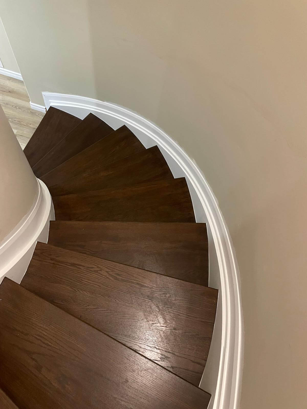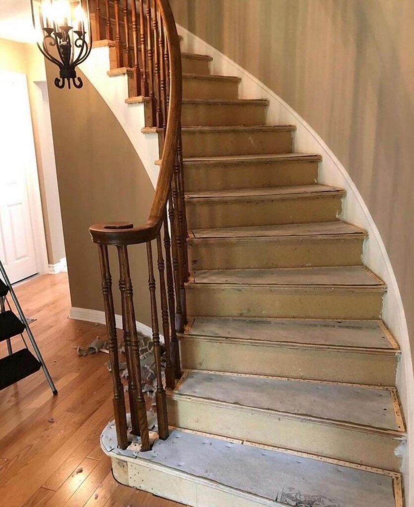 Our team conducted an in-home assessment, carefully measuring each curved tread’s unique dimensions and radius. We evaluated the existing structure, assessed railing attachment points, and documented the curve’s specifications. Curved stairs require exact measurements—precision was critical for proper fit.