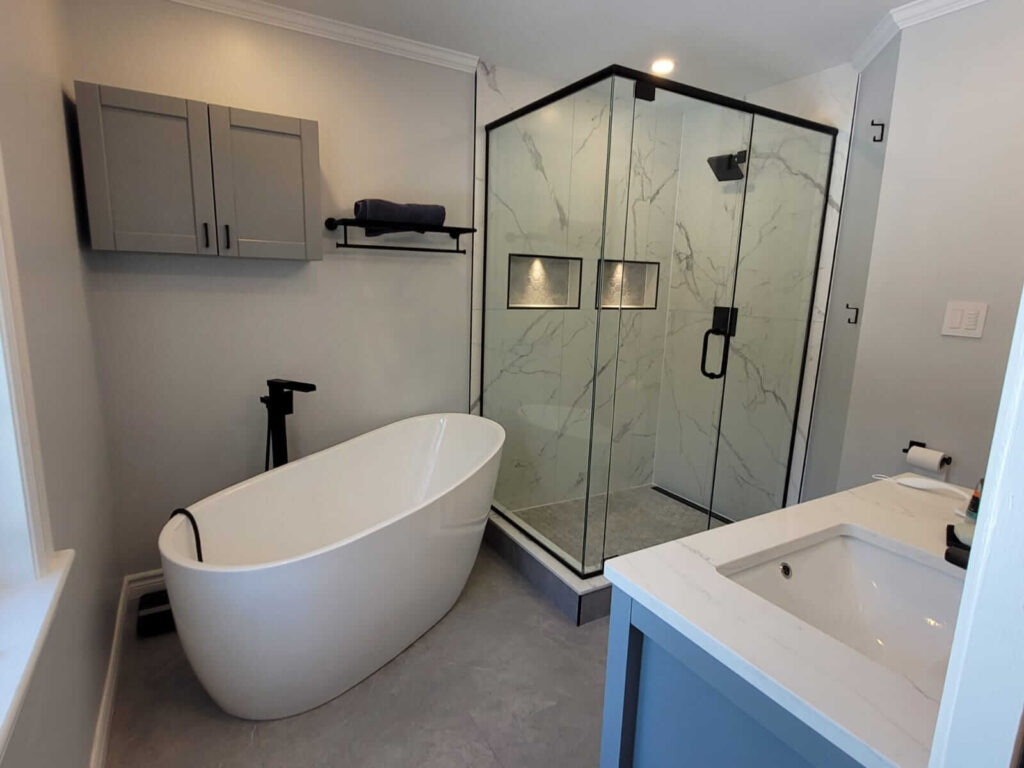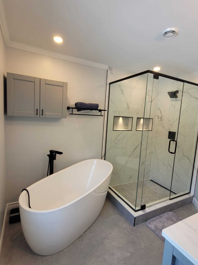 The transformation created a bathroom that exceeds even luxury hotel standards. The heated tile flooring provides warm comfort from the moment you step out of the shower—especially appreciated during Ottawa’s cold winter months. The Ditra system not only powers the radiant heat but also provides critical waterproofing and crack prevention beneath the beautiful large-format tiles. The seamless tile installation, from floor to shower walls, showcases precision craftsmanship—perfectly aligned grout lines, flawless transitions, and expert waterproofing that ensures lasting performance. The coordinated design elements—from the marble-look shower tiles to the contemporary fixtures—create visual harmony throughout the space. The freestanding bathtub and frameless glass shower enclosure add luxury touches while maintaining the clean, modern aesthetic. This project demonstrates our expertise in complex bathroom renovations where technical requirements—heated flooring systems, waterproofing, tile installation, plumbing integration—must align perfectly with design vision. We backed this transformation with our comprehensive warranty and remain available for any questions about maintaining their heated flooring system.