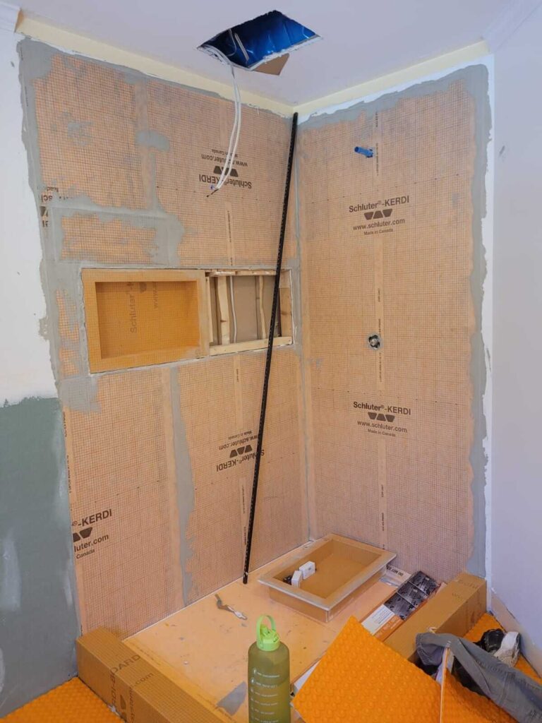 Our team conducted a detailed in-home assessment, measuring the bathroom layout, evaluating subfloor condition, assessing electrical requirements for heated flooring, and planning drainage and waterproofing. We documented plumbing locations and discussed the technical scope—tile installation, Ditra system, heating cables, and fixture placement.